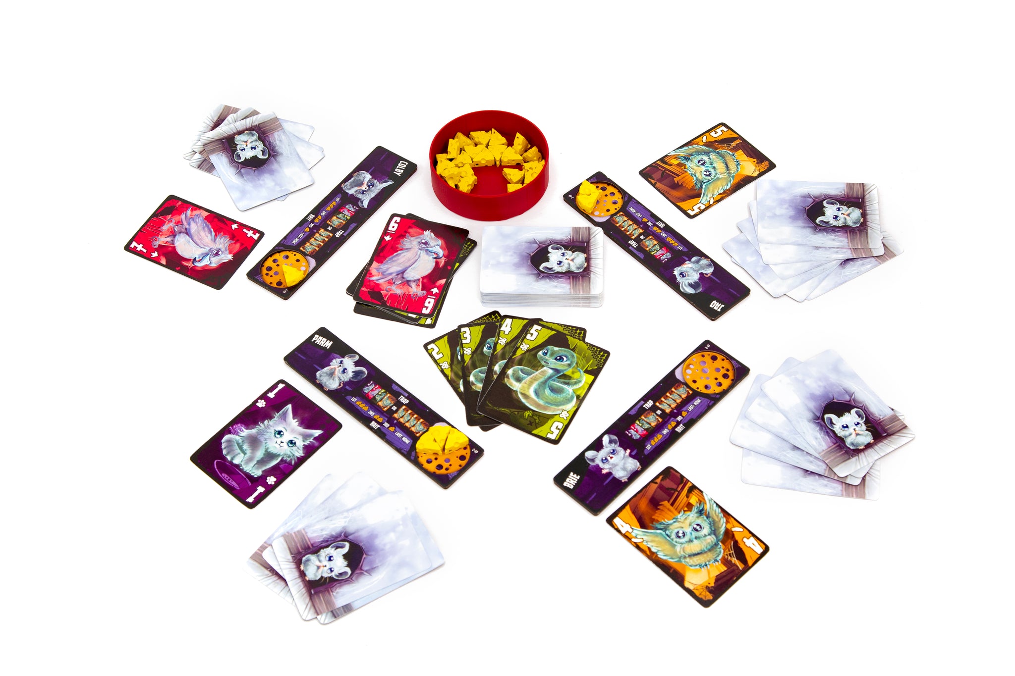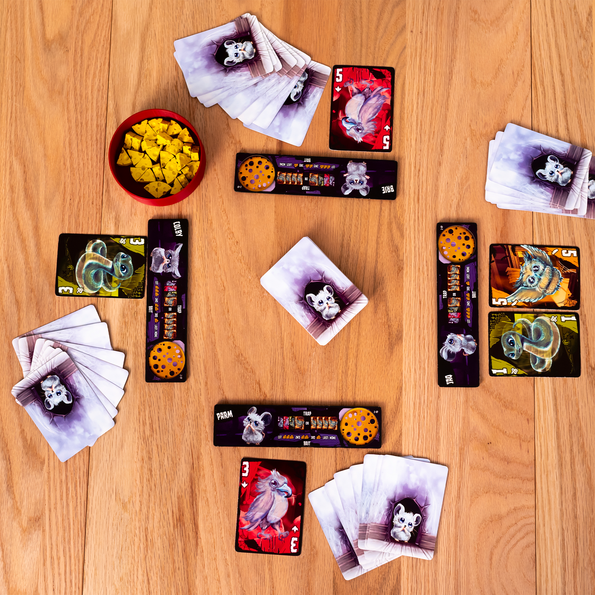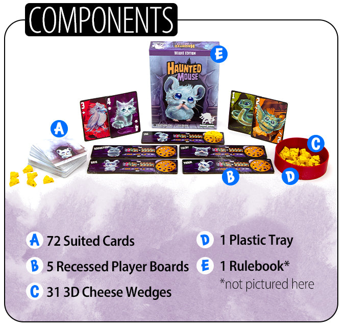 Haunted Mouseis a ladder climbing/shedding game where mice not only shed their own fears (cards), but can use the fears of others! After all, why work hard shedding your own fears when your opponents can do it for you? The earlier you get rid of all your fears, the more cheese you get! Be the first mouse to complete their cheese wheel wins the game and never goes hungry again!